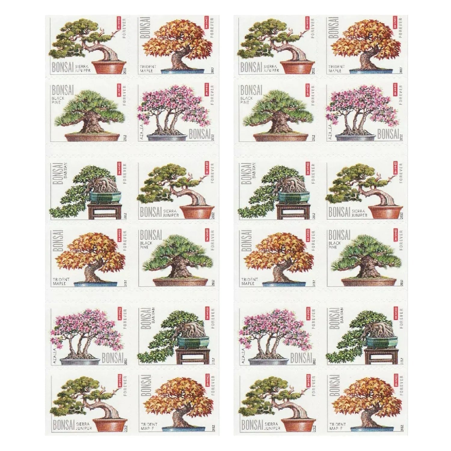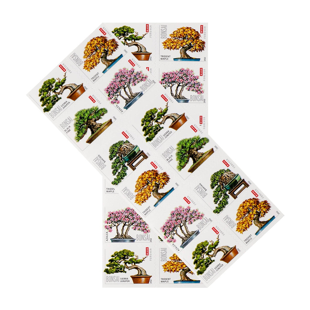 With these five Bonsai (Forever) stamps. the U.S. Postal Service celebrates the beauty of bonsai. The word ???bonsai???? (China for ???plant in a pot????) refers to the art of cultivating plants. usually trees. in trays. pots. or other containers. Favorite bonsai plants include evergreens. maples. and azaleas. but many other trees and shrubs are also suitable.