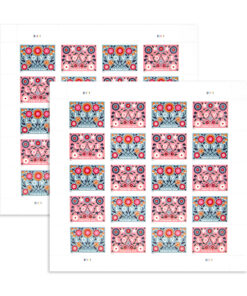 Celebrate the joy that flowers bring with two new Love stamps from the U.S. Postal Service. Inspired by old European folk art. the two stamps feature digital illustrations with similar designs: three round. stylized blooms ranging symmetrically along the top. with smaller round blossoms in each of the lower corners