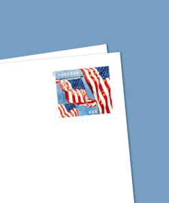The stamp art is a painting of three flags in a circular formation. reminiscent of the 50 flags encircling the Washington Monument. The artist used three separate photographs of the same flag taken seconds apart as reference and stitched together the images into a single composition. Laura Stutzman was the stamp designer and illustrator. Ethel Kessler was the art director.