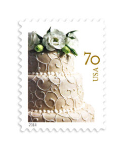 The watercolor backgrounds were painted by hand and scanned. The background for the $10 stamp is red; white geometric lines and typography were added digitally. A foil treatment adds a stylish glimmer.
